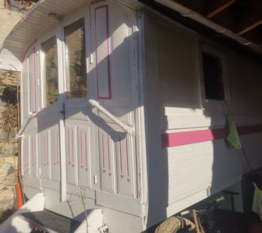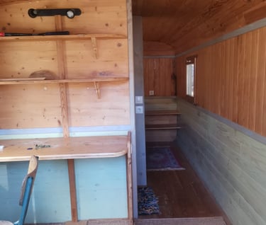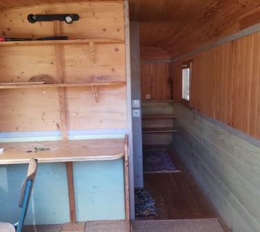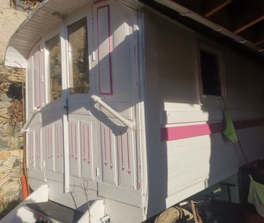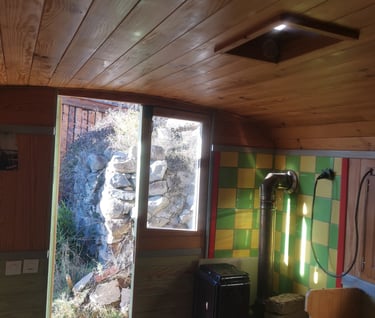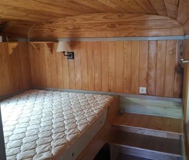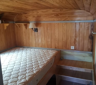 La roulotte avec un lit 2 places... Un petit poêle et le charme du bois. Elle se trouve en haut du campement. Proche de la cuisine ouverte d'été, elle profite de l'ambiance !